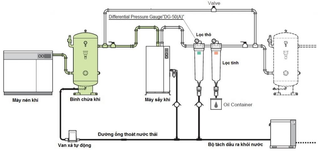 Cũng giống như cách lắp đặt trên, do máy sấy khí luôn hoạt động hết công suất nên cần lựa chọn dung lượng lớn hơn 1, 2 lần nếu muốn lắp đặt bình chứa khí giữa máy sấy khí và các bộ lọc này..